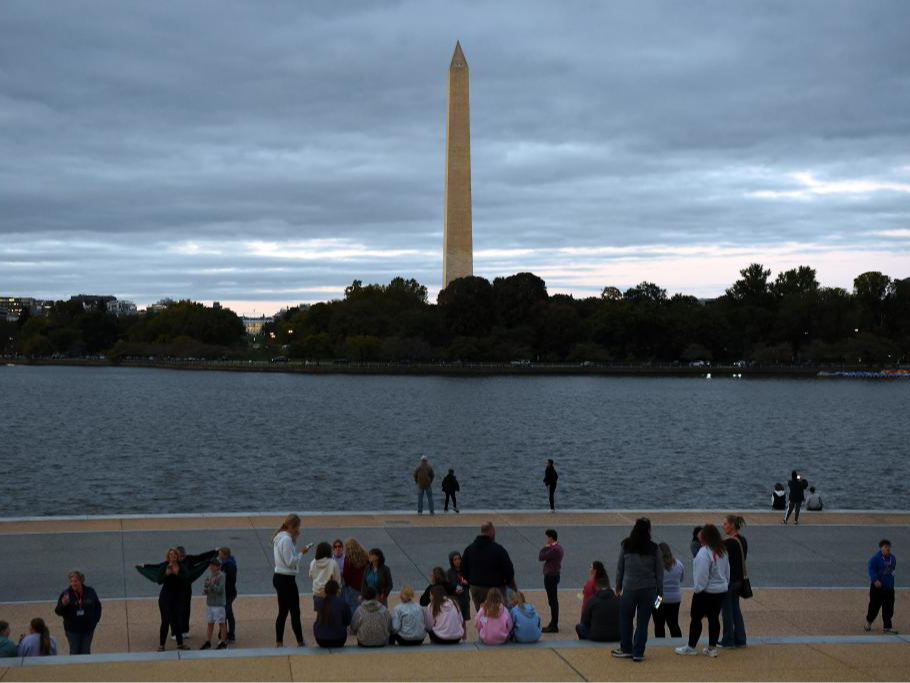 这是10月14日在美国华盛顿杰斐逊纪念堂前拍摄的华盛顿纪念碑。新华社记者李睿摄