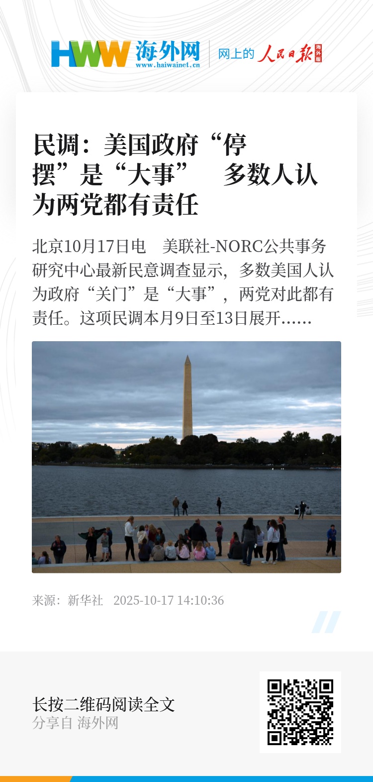 新华社北京10月17日电 美联社-NORC公共事务研究中心最新民意调查显示,多数美国人认为政府“关门”是“大事”,两党对此都有责任。