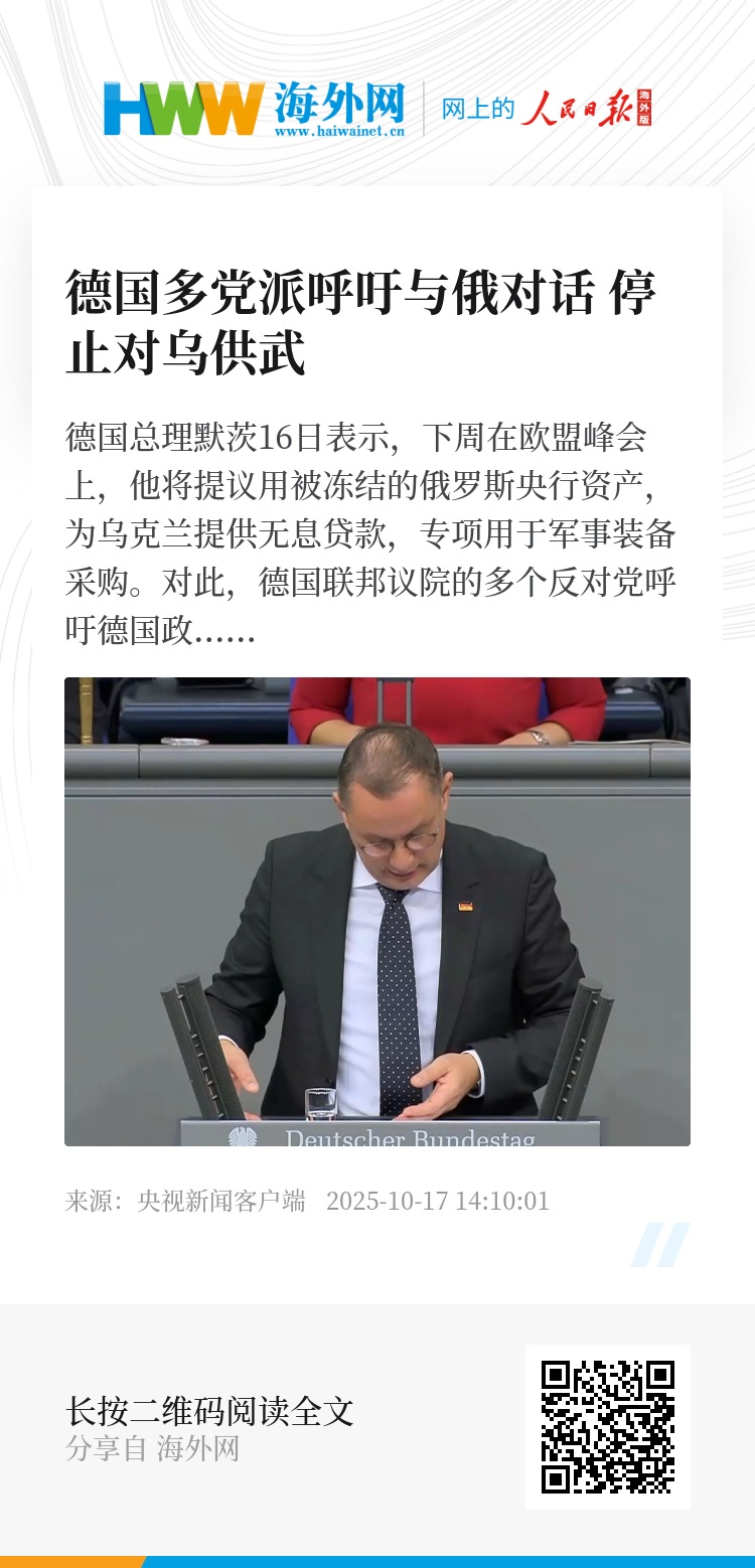 德国总理默茨16日表示,下周在欧盟峰会上,他将提议用被冻结的俄罗斯央行资产,为乌克兰提供无息贷款,专项用于军事装备采购。对此,德国联邦议院的多个反对党呼吁德国政府停止向乌克兰提供武器,转而与俄罗斯进行对话,通过外交途径解决俄乌冲突。