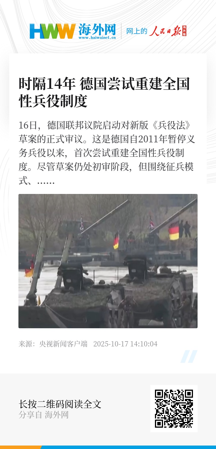 16日,德国联邦议院启动对新版《兵役法》草案的正式审议。这是德国自2011年暂停义务兵役以来,首次尝试重建全国性兵役制度。尽管草案仍处初审阶段,但围绕征兵模式、社会接受度及执政联盟内部分歧的争论,已在德国政坛持续发酵。