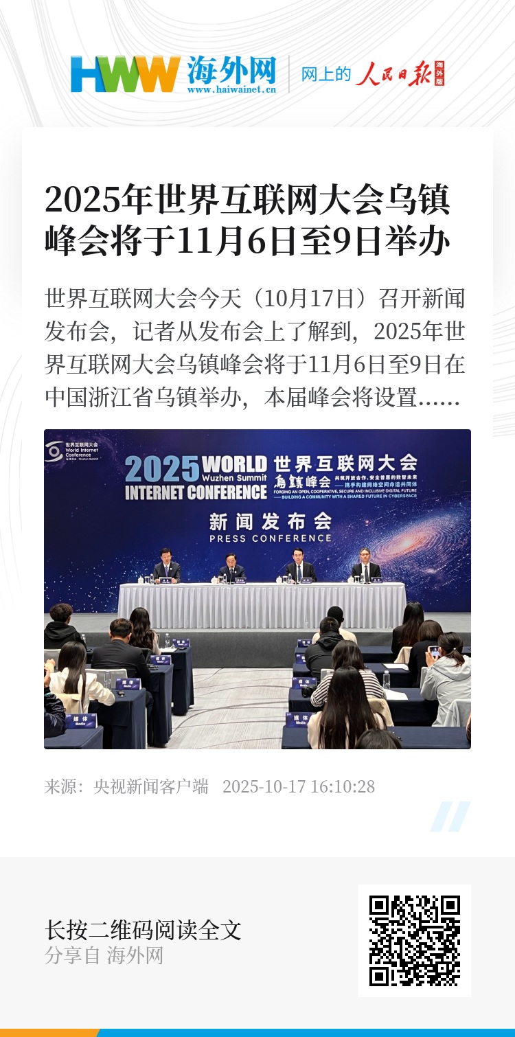 世界互联网大会今天(10月17日)召开新闻发布会,记者从发布会上了解到,2025年世界互联网大会乌镇峰会将于11月6日至9日在中国浙江省乌镇举办,本届峰会将设置24个分论坛。2025年是构建网络空间命运共同体理念提出10周年,本届乌镇峰会主题确定为“共筑开放合作、安全普惠的数智未来——携手构建网络空间命运共同体”,峰会期间,将举办构建网络空间命运共同体理念10周年理论研讨会,总结该理念提出以来的理论成果和实践经验,携手各方,形成落实该理念的更广泛合力。