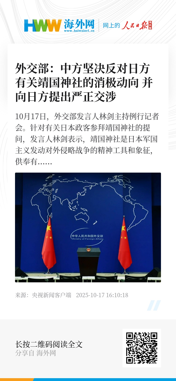 10月17日,外交部发言人林剑主持例行记者会。针对有关日本政客参拜靖国神社的提问,发言人林剑表示,靖国神社是日本军国主义发动对外侵略战争的精神工具和象征,供奉有对侵略战争负有严重罪责的14名甲级战犯。中方坚决反对日方有关靖国神社的消极动向,并向日方提出严正交涉。