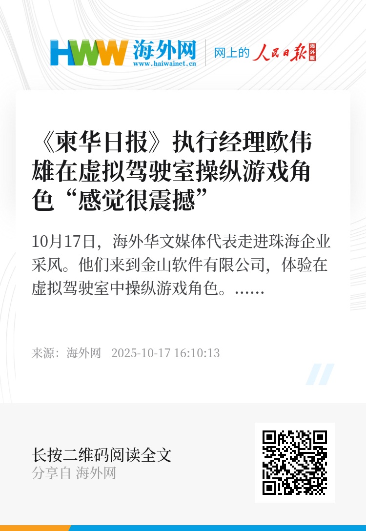10月17日,海外华文媒体代表走进珠海企业采风。他们来到金山软件有限公司,体验在虚拟驾驶室中操纵游戏角色。