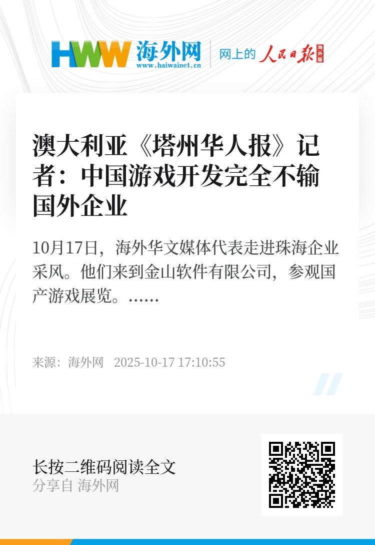 10月17日,海外华文媒体代表走进珠海企业采风。他们来到金山软件有限公司,参观国产游戏展览。