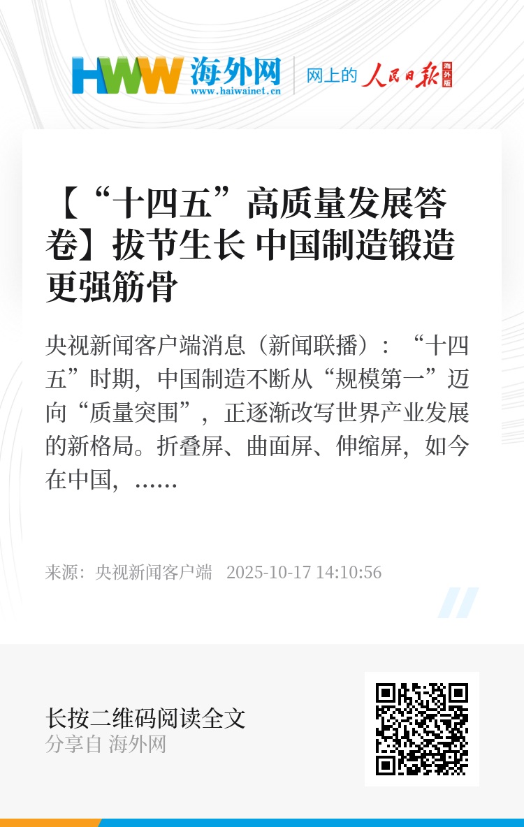 央视新闻客户端消息(新闻联播):“十四五”时期,中国制造不断从“规模第一”迈向“质量突围”,正逐渐改写世界产业发展的新格局。
