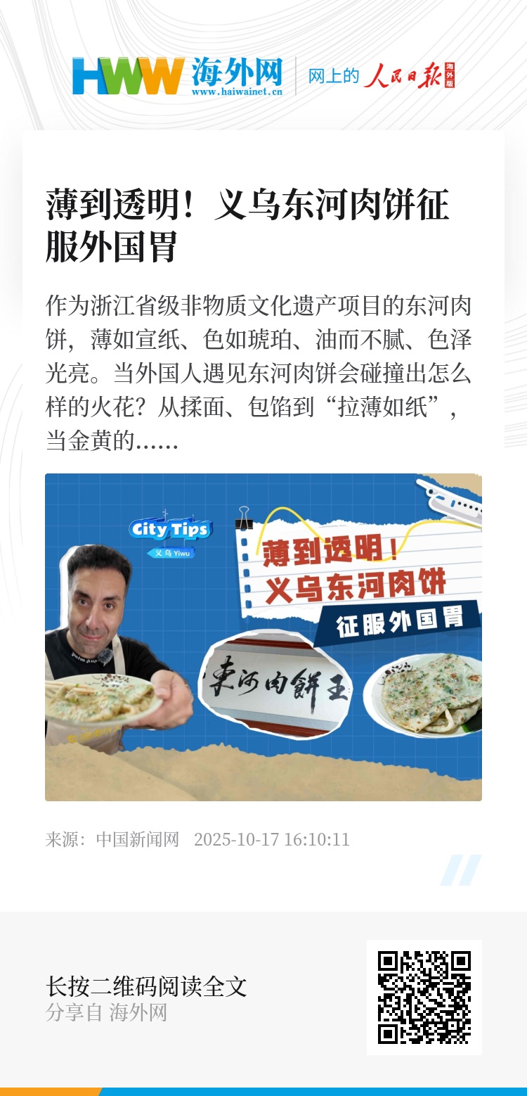作为浙江省级非物质文化遗产项目的东河肉饼,薄如宣纸、色如琥珀、油而不腻、色泽光亮。当外国人遇见东河肉饼会碰撞出怎么样的火花?从揉面、包馅到“拉薄如纸”,当金黄的肉饼出炉,隔着屏幕香味都已扑鼻。戳视频,义乌东河肉饼一起学起来。