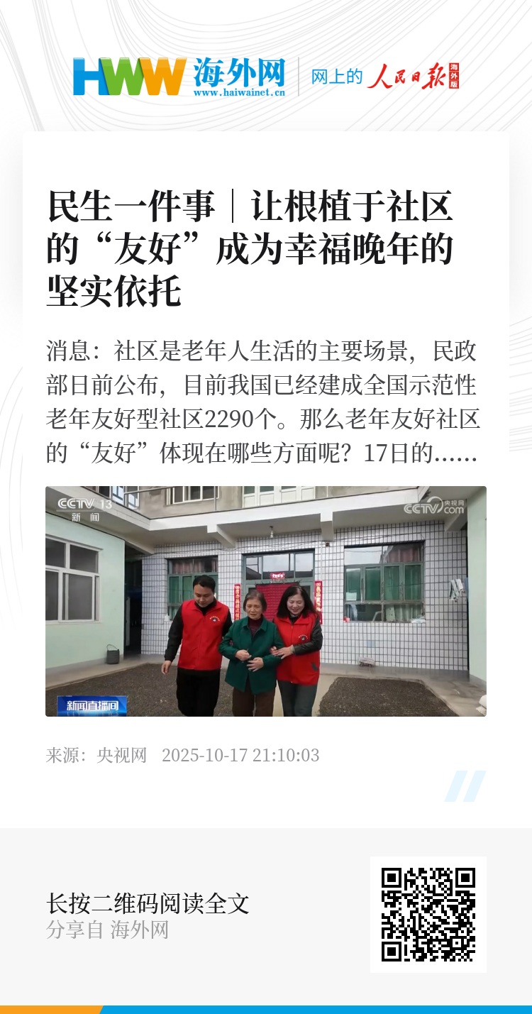 央视网消息:社区是老年人生活的主要场景,民政部日前公布,目前我国已经建成全国示范性老年友好型社区2290个。那么老年友好社区的“友好”体现在哪些方面呢?17日的民生一件事,我们就一起来了解。