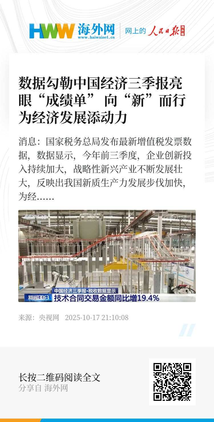 央视网消息:国家税务总局发布最新增值税发票数据,数据显示,今年前三季度,企业创新投入持续加大,战略性新兴产业不断发展壮大,反映出我国新质生产力发展步伐加快,为经济发展注入新动力。