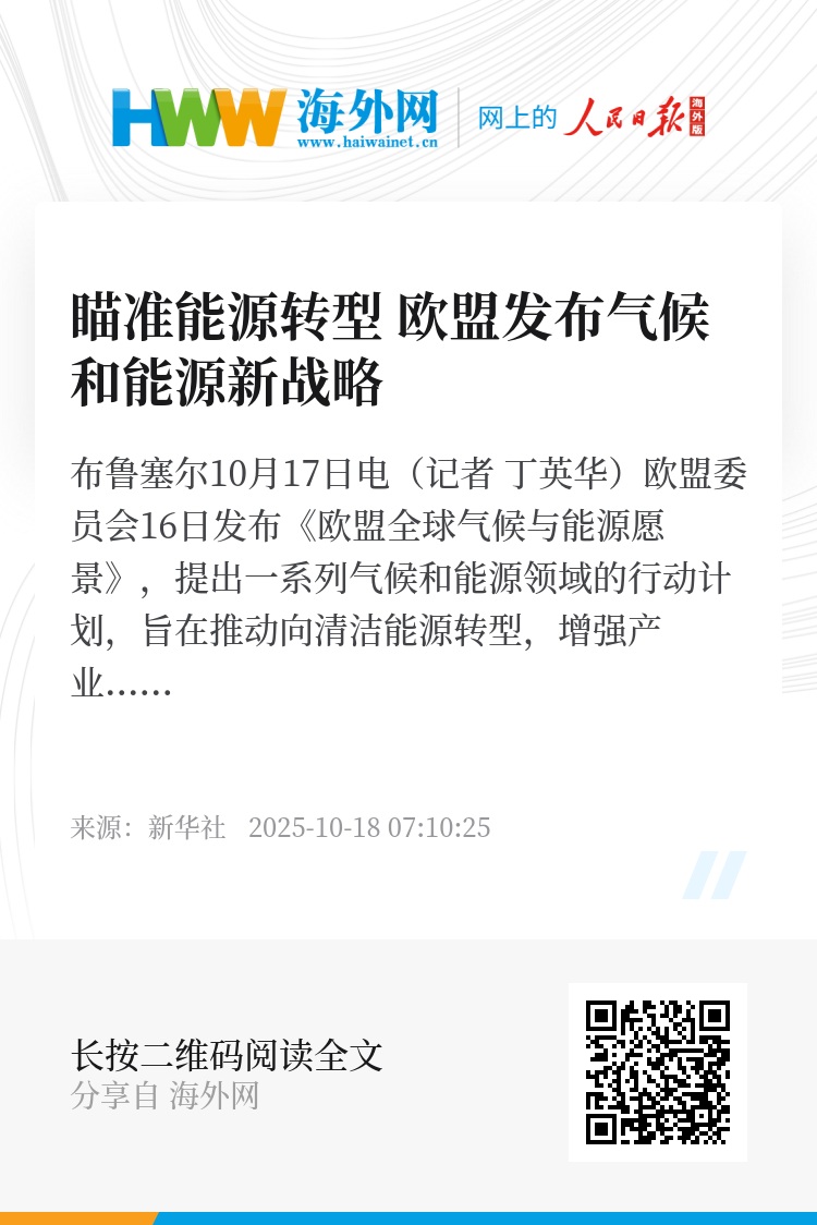 新华社布鲁塞尔10月17日电(记者 丁英华)欧盟委员会16日发布《欧盟全球气候与能源愿景》,提出一系列气候和能源领域的行动计划,旨在推动向清洁能源转型,增强产业国际竞争力。