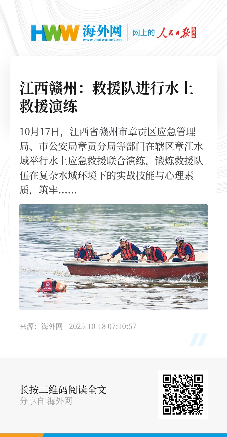 10月17日,江西省赣州市章贡区应急管理局、市公安局章贡分局等部门在辖区章江水域举行水上应急救援联合演练,锻炼救援队伍在复杂水域环境下的实战技能与心理素质,筑牢水上安全防线,维护辖区水域平安稳定。图源:视觉中国