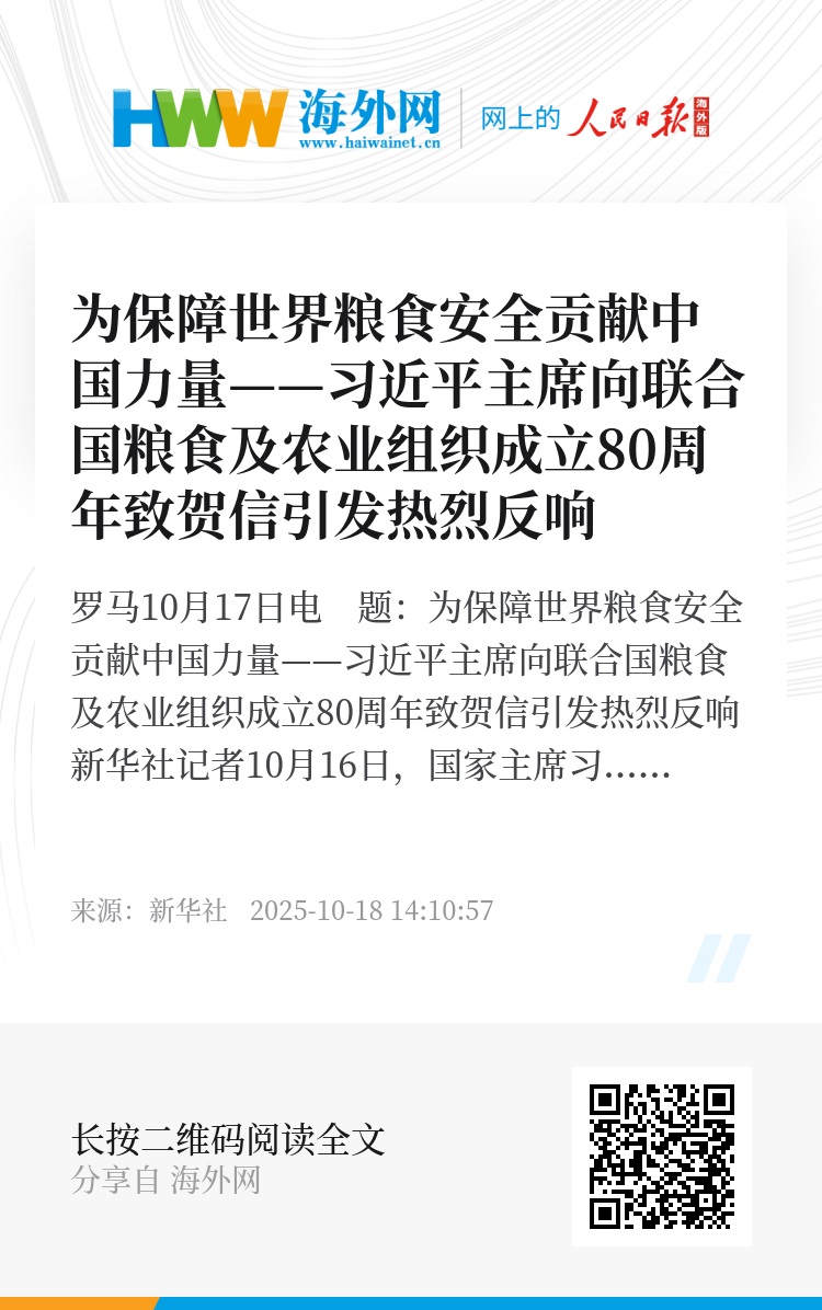 新华社罗马10月17日电 题:为保障世界粮食安全贡献中国力量——习近平主席向联合国粮食及农业组织成立80周年致贺信引发热烈反响