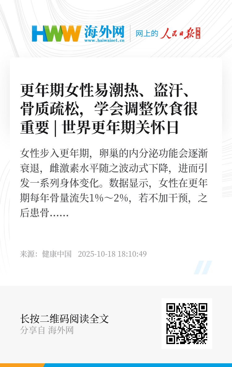 女性步入更年期,卵巢的内分泌功能会逐渐衰退,雌激素水平随之波动式下降,进而引发一系列身体变化。数据显示,女性在更年期每年骨量流失1%~2%,若不加干预,之后患骨质疏松症的风险将大大增加。同时,雌激素水平降低还可能影响血脂代谢,使得心血管疾病的发病率上升。此外,更年期女性的基础代谢率平均降低5%~10%,这意味着身体消耗能量的能力减弱。如果仍然保持以往的饮食习惯,很容易导致体重增加、脂肪堆积。因此,在饮食调节上,不仅要补充特定的营养素,还要合理控制能量摄入。