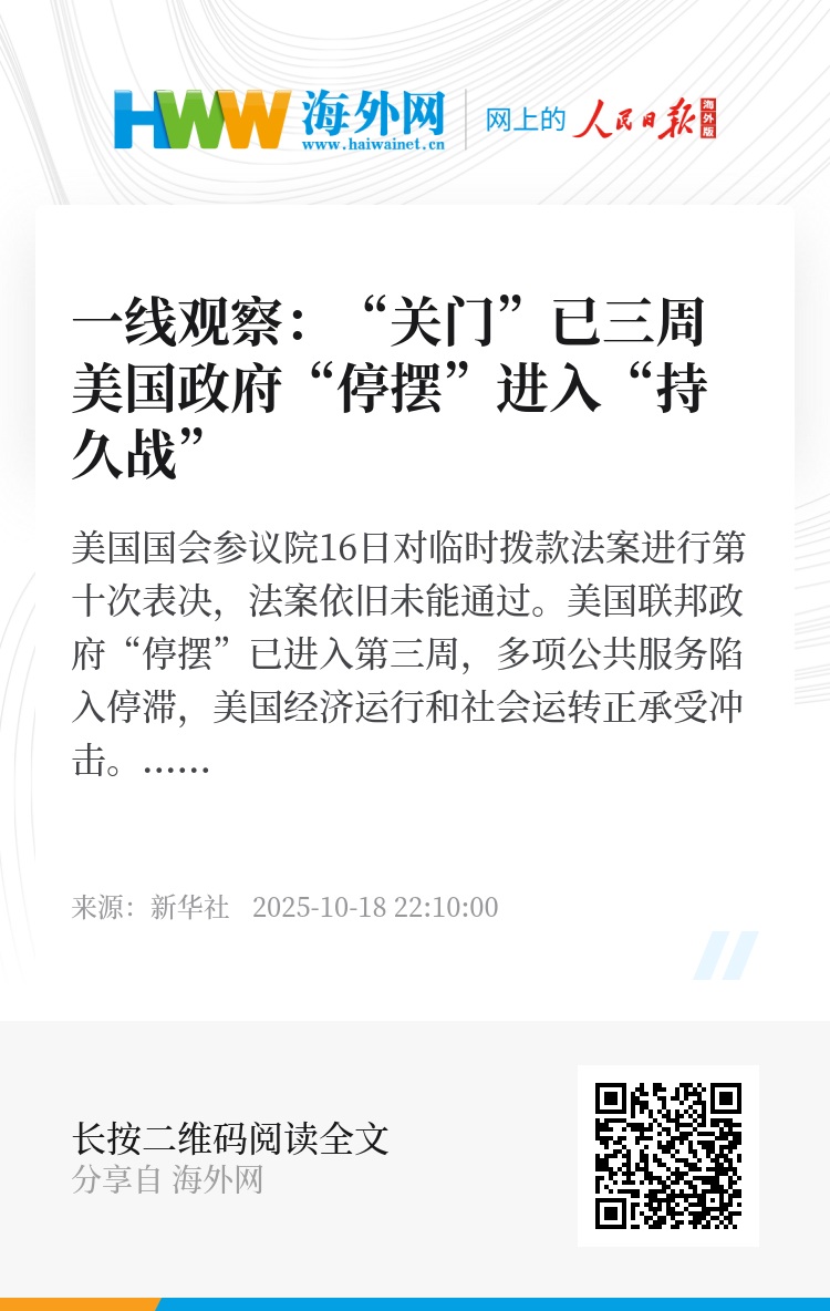 美国国会参议院16日对临时拨款法案进行第十次表决,法案依旧未能通过。美国联邦政府“停摆”已进入第三周,多项公共服务陷入停滞,美国经济运行和社会运转正承受冲击。