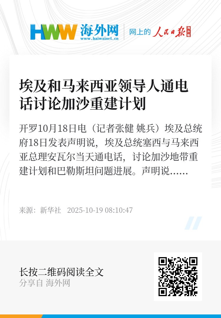 新华社开罗10月18日电(记者张健 姚兵)埃及总统府18日发表声明说,埃及总统塞西与马来西亚总理安瓦尔当天通电话,讨论加沙地带重建计划和巴勒斯坦问题进展。
