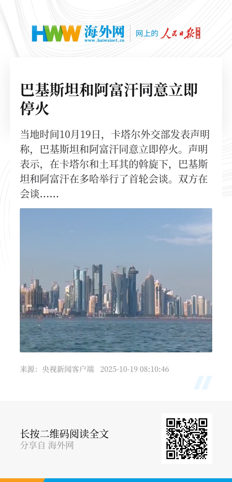 当地时间10月19日,卡塔尔外交部发表声明称,巴基斯坦和阿富汗同意立即停火。