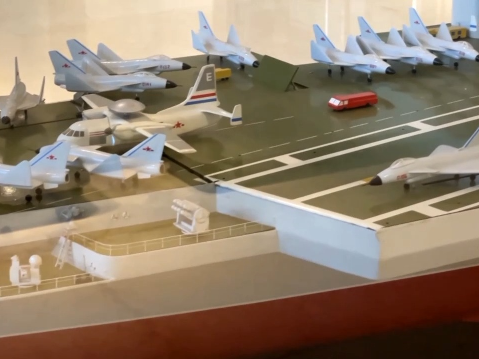 通过“891”工程研究成果的展示模型,可以看到平直甲板、蒸汽弹射器、拦阻装置……