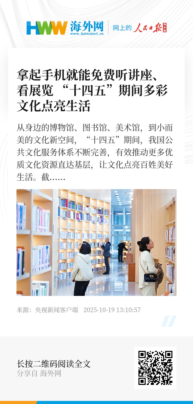 从身边的博物馆、图书馆、美术馆,到小而美的文化新空间,“十四五”期间,我国公共文化服务体系不断完善,有效推动更多优质文化资源直达基层,让文化点亮百姓美好生活。