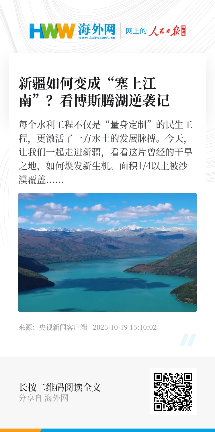博斯腾湖是新疆治水的缩影。“十四五”以来,新疆在水利建设上投资了1580亿元,建成了18座大中型水库和28座小型水源工程。全区农村自来水普及率达到99.4%。连续26次向塔里木河下游生态输水;地下水开采量由2021年的147.1亿立方米下降至2024年的118.7亿立方米。
