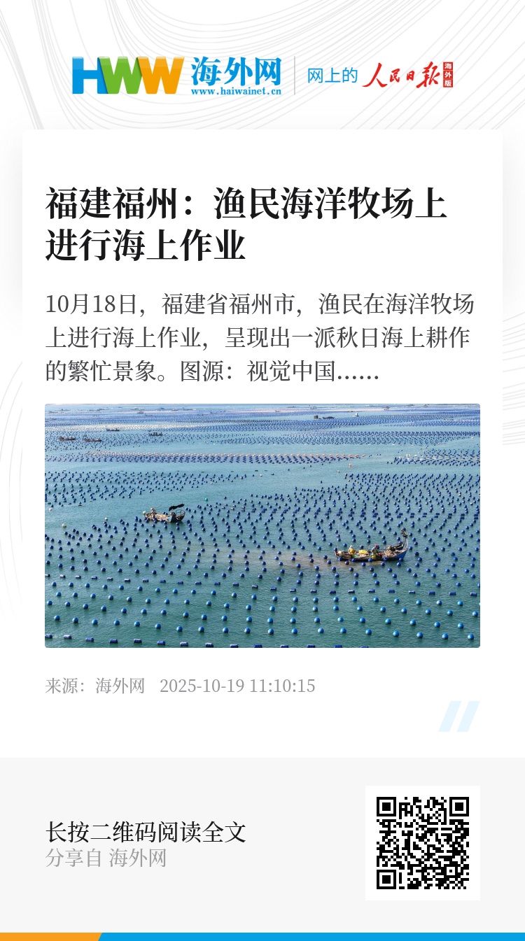10月18日,福建省福州市,渔民在海洋牧场上进行海上作业,呈现出一派秋日海上耕作的繁忙景象。图源:视觉中国