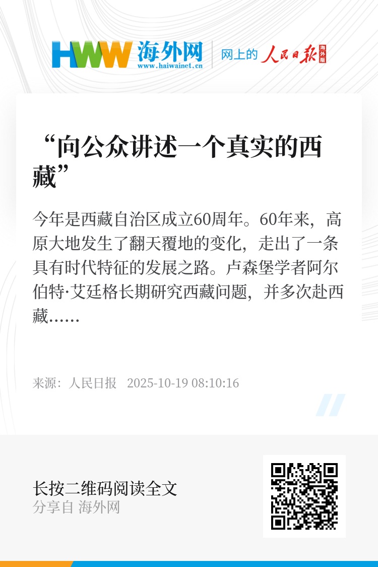 今年是西藏自治区成立60周年。60年来,高原大地发生了翻天覆地的变化,走出了一条具有时代特征的发展之路。卢森堡学者阿尔伯特·艾廷格长期研究西藏问题,并多次赴西藏实地考察。他在接受本报记者采访时说:“我的所见所闻、收集到的信息、在西藏结识的人以及交流的经历,都让我认识到,真实的西藏与西方固有印象之间有着巨大差别。”