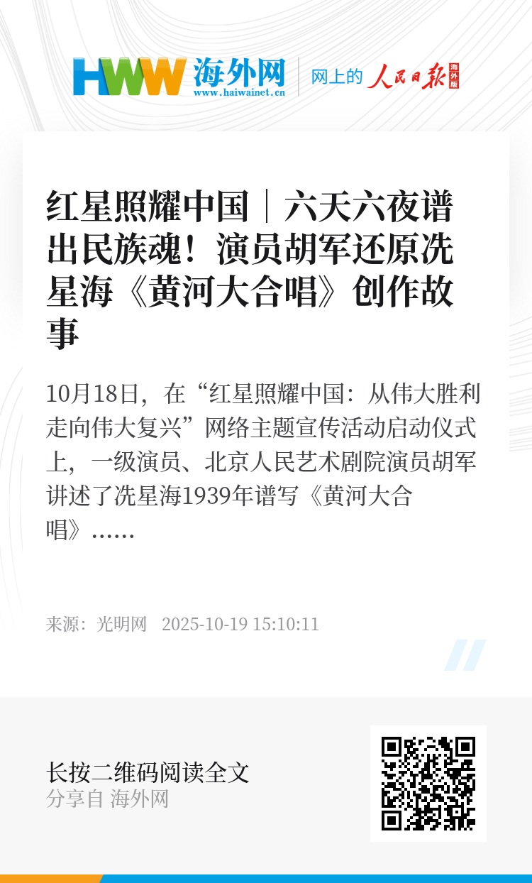 10月18日,在“红星照耀中国:从伟大胜利走向伟大复兴”网络主题宣传活动启动仪式上,一级演员、北京人民艺术剧院演员胡军讲述了冼星海1939年谱写《黄河大合唱》的故事:在窑洞里六天六夜不合眼,累了就嚼把白糖,让一串串音符变成抗日的“武器”。(雷渺鑫)