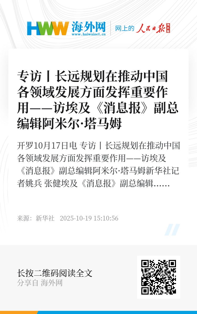 新华社开罗10月17日电 专访丨长远规划在推动中国各领域发展方面发挥重要作用——访埃及《消息报》副总编辑阿米尔·塔马姆