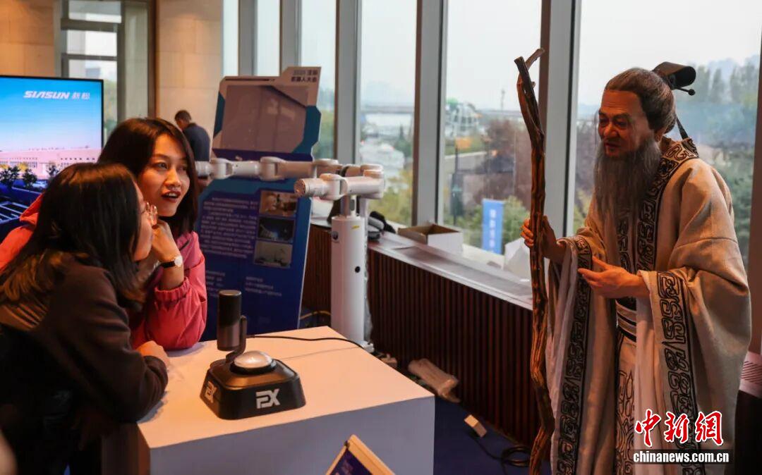 2025年10月17日,2025沈阳机器人大会在辽宁沈阳开幕。图为观众与交互型仿生人形机器人孔子互动。 中新社记者 于海洋 摄