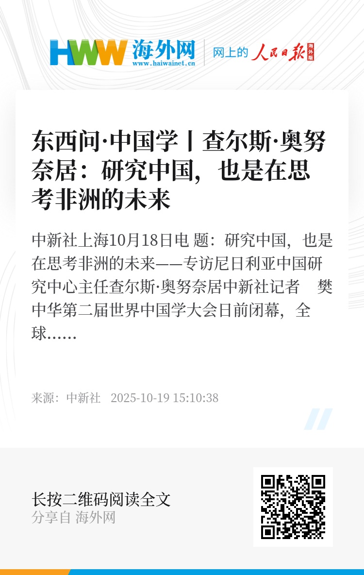 查尔斯·奥努奈居:我们有一批学者正在重新审视旧有观念,摒弃过往偏见。在非洲,“极权”“封闭”等对中国的刻板印象已失去市场,因为事实胜于雄辩。人们开始通过实践认识真相,我们越来越清楚地看到,非中之间的共同点远超预期。随着交流逐渐深入,共识也不断增多。