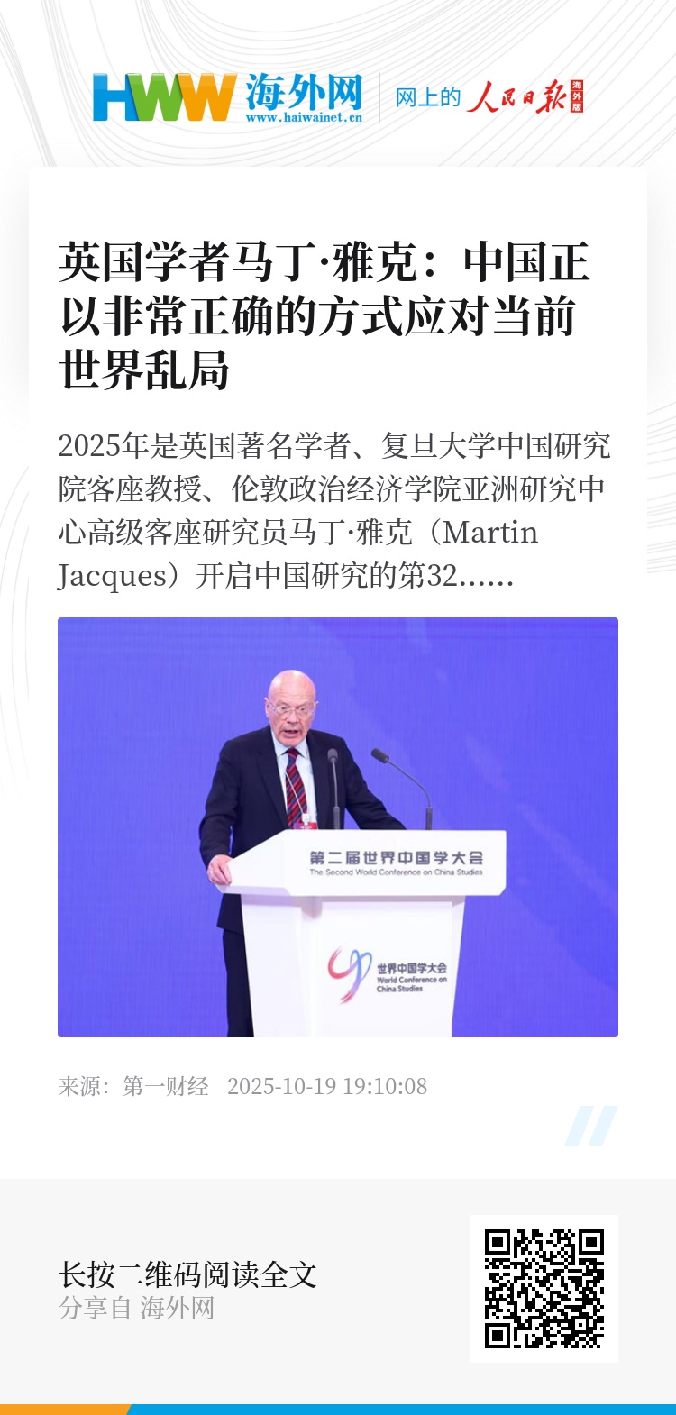 2025年是英国著名学者、复旦大学中国研究院客座教授、伦敦政治经济学院亚洲研究中心高级客座研究员马丁·雅克(Martin Jacques)开启中国研究的第32年。日前,80岁的他在第二届世界中国学大会期间接受第一财经的采访,在他看来,当前全球局势处于非常不稳定的状态,危机正以罕见的形式发生。