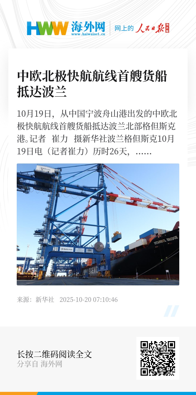 新华社波兰格但斯克10月19日电(记者崔力)历时26天,中欧北极集装箱快航航线首艘货船19日凌晨抵达波兰北部格但斯克港。