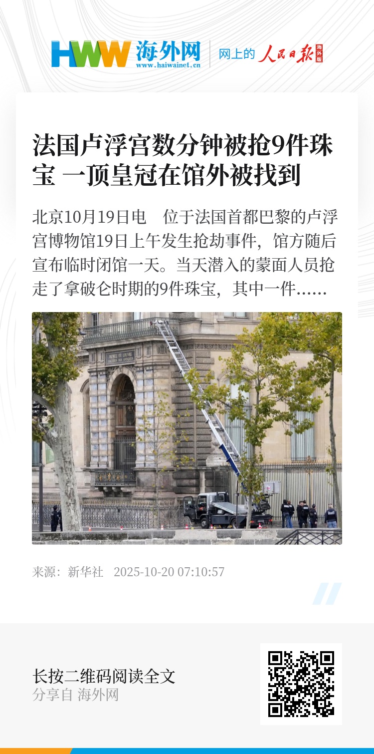 新华社北京10月19日电 位于法国首都巴黎的卢浮宫博物馆19日上午发生抢劫事件,馆方随后宣布临时闭馆一天。当天潜入的蒙面人员抢走了拿破仑时期的9件珠宝,其中一件遭抢文物在博物馆外被发现。