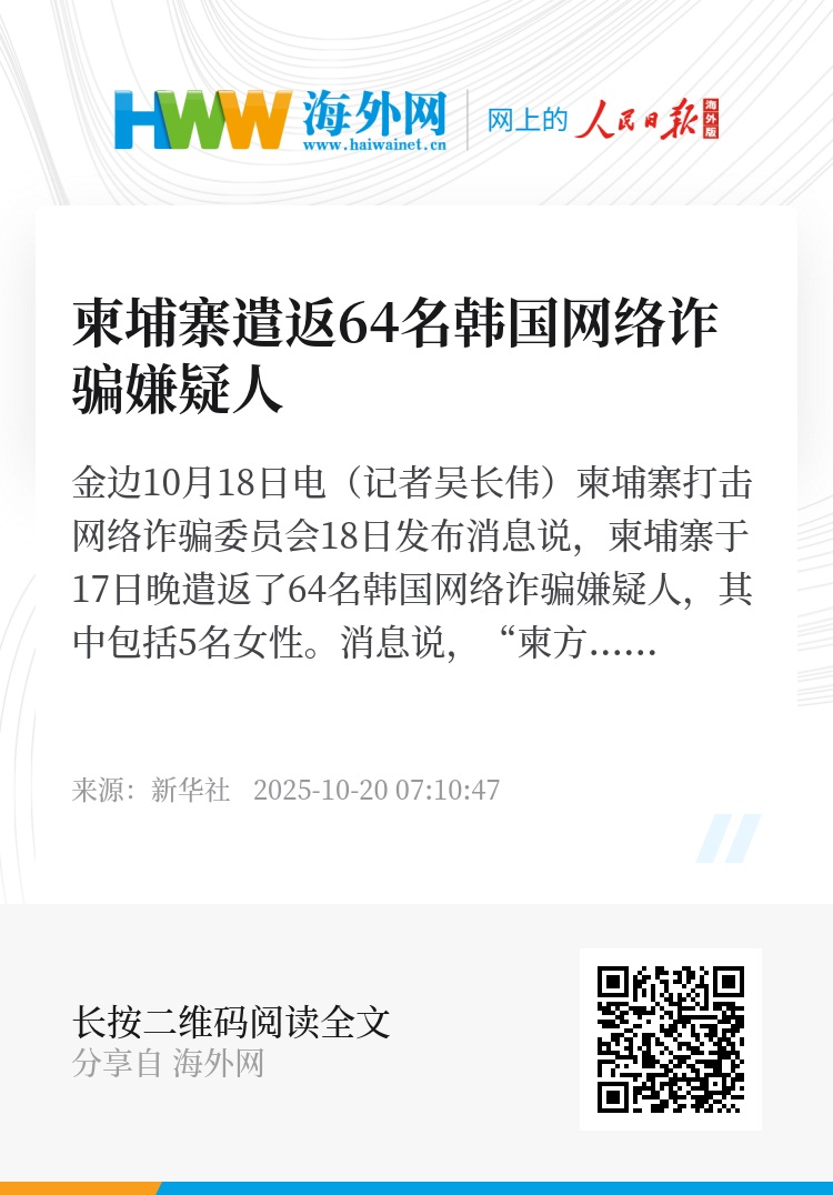 新华社金边10月18日电(记者吴长伟)柬埔寨打击网络诈骗委员会18日发布消息说,柬埔寨于17日晚遣返了64名韩国网络诈骗嫌疑人,其中包括5名女性。