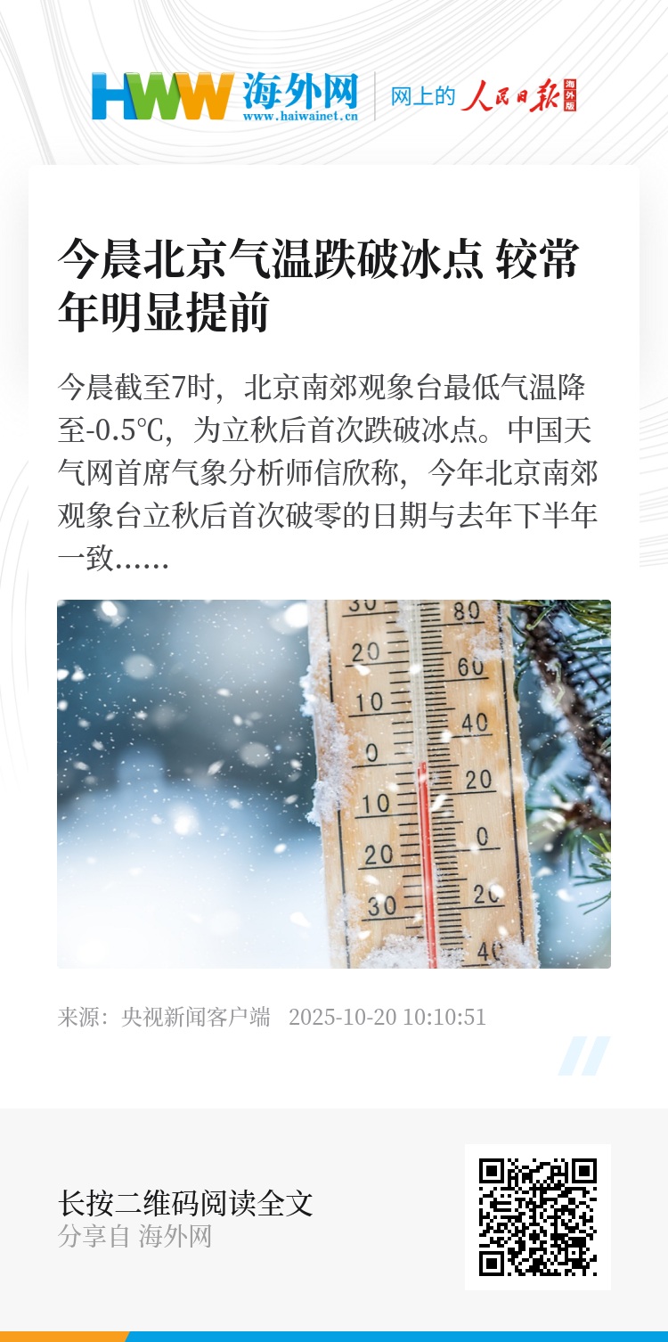 今晨截至7时,北京南郊观象台最低气温降至-0.5℃,为立秋后首次跌破冰点。