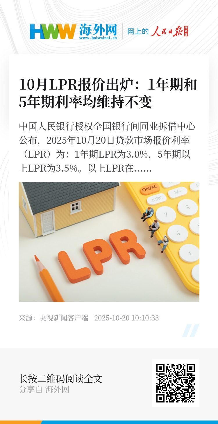 中国人民银行授权全国银行间同业拆借中心公布,2025年10月20日贷款市场报价利率(LPR)为:1年期LPR为3.0%,5年期以上LPR为3.5%。以上LPR在下一次发布LPR之前有效。