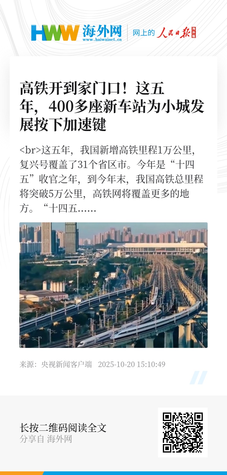 这五年,我国新增高铁里程1万公里,复兴号覆盖了31个省区市。今年是“十四五”收官之年,到今年末,我国高铁总里程将突破5万公里,高铁网将覆盖更多的地方。“十四五”期间,列车经停的车站也越来越多。这五年,我国16万多公里铁路线上新增了400余座车站,奔驰的列车在更多地方驻足,也给更多的人带来生活的改变。