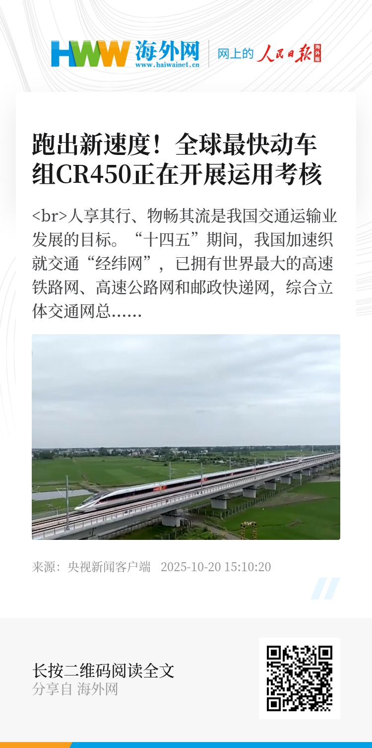 总台央视记者 郑连凯:我身后就是正在开展运用考核的CR450动车组。什么是“运用考核”呢,通俗地说,就是“刷里程”。因为从去年底样车下线以来,它就一直在进行各种的达标考试,经过一轮又一轮的周考、月考、期中考,已经交出了时速450公里的答卷,各项指标都已经合格,但是考试还得继续,因为按照技术要求,CR450要在指标合格的前提下,跑够60万公里,才能够载客运营。从我们现在所在的宜昌北站开始,到荆门、汉川等站的这条近300公里的高铁线。