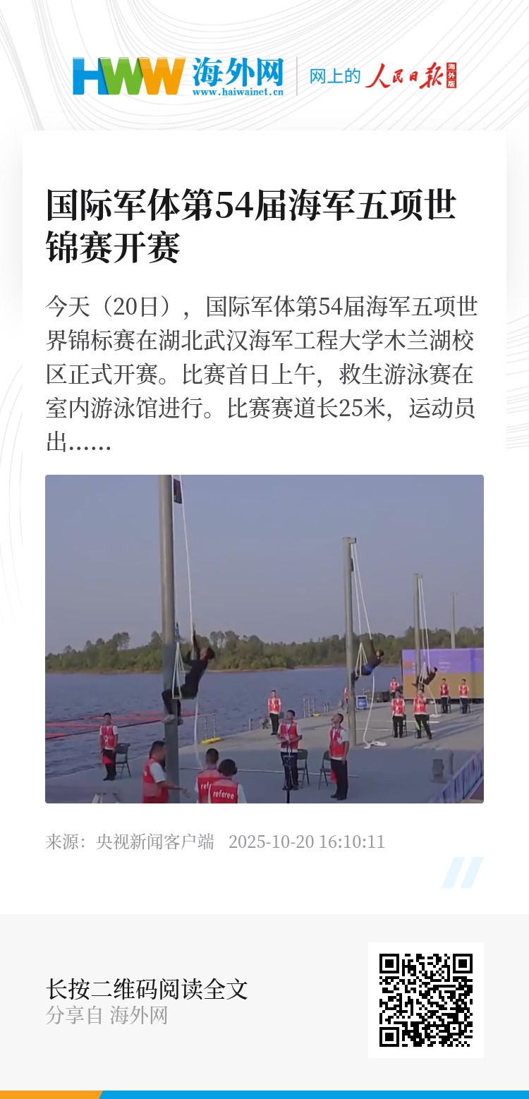 今天(20日),国际军体第54届海军五项世界锦标赛在湖北武汉海军工程大学木兰湖校区正式开赛。