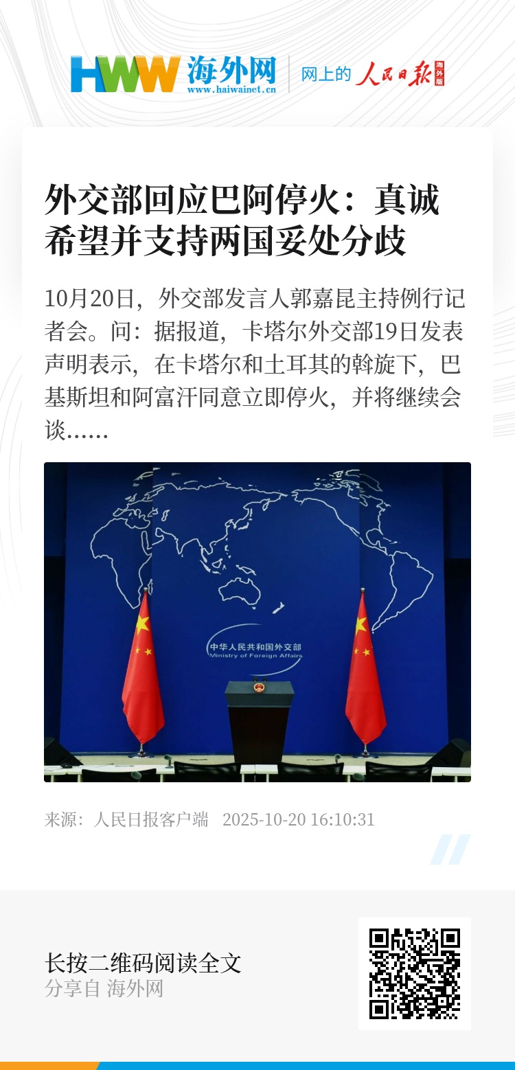 问:据报道,卡塔尔外交部19日发表声明表示,在卡塔尔和土耳其的斡旋下,巴基斯坦和阿富汗同意立即停火,并将继续会谈确保实现停火的可持续性。巴基斯坦国防部长阿西夫确认巴阿停火,并称双方将于25日在伊斯坦布尔再次会谈。中方对此有何评论?