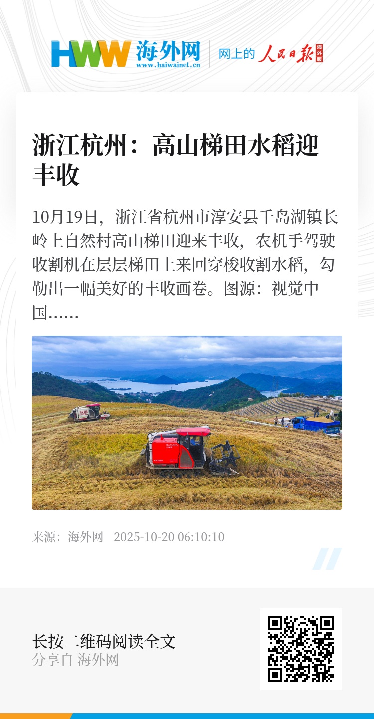 10月19日,浙江省杭州市淳安县千岛湖镇长岭上自然村高山梯田迎来丰收,农机手驾驶收割机在层层梯田上来回穿梭收割水稻,勾勒出一幅美好的丰收画卷。图源:视觉中国