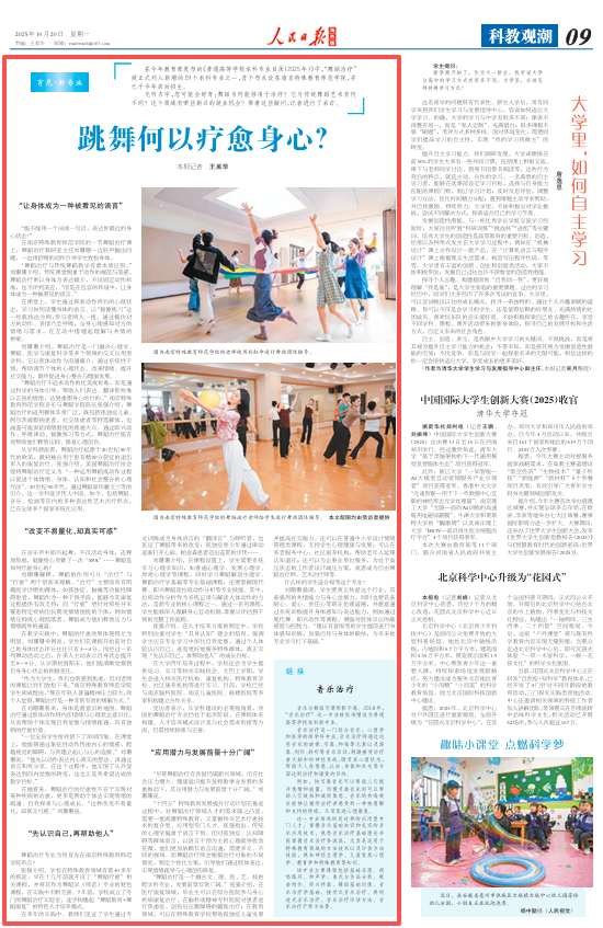 在教学实践中,舞蹈的疗愈效果体现得尤为明显。刘珊珊举例说,学生们在课程开始前对自己的身体状态评分往往只有3—4分,而经过一系列舞动活动之后,许多人主动表示自身状态提升至8—9分。从学期初到期末,他们能清晰觉察到自身身心状态的积极变化。