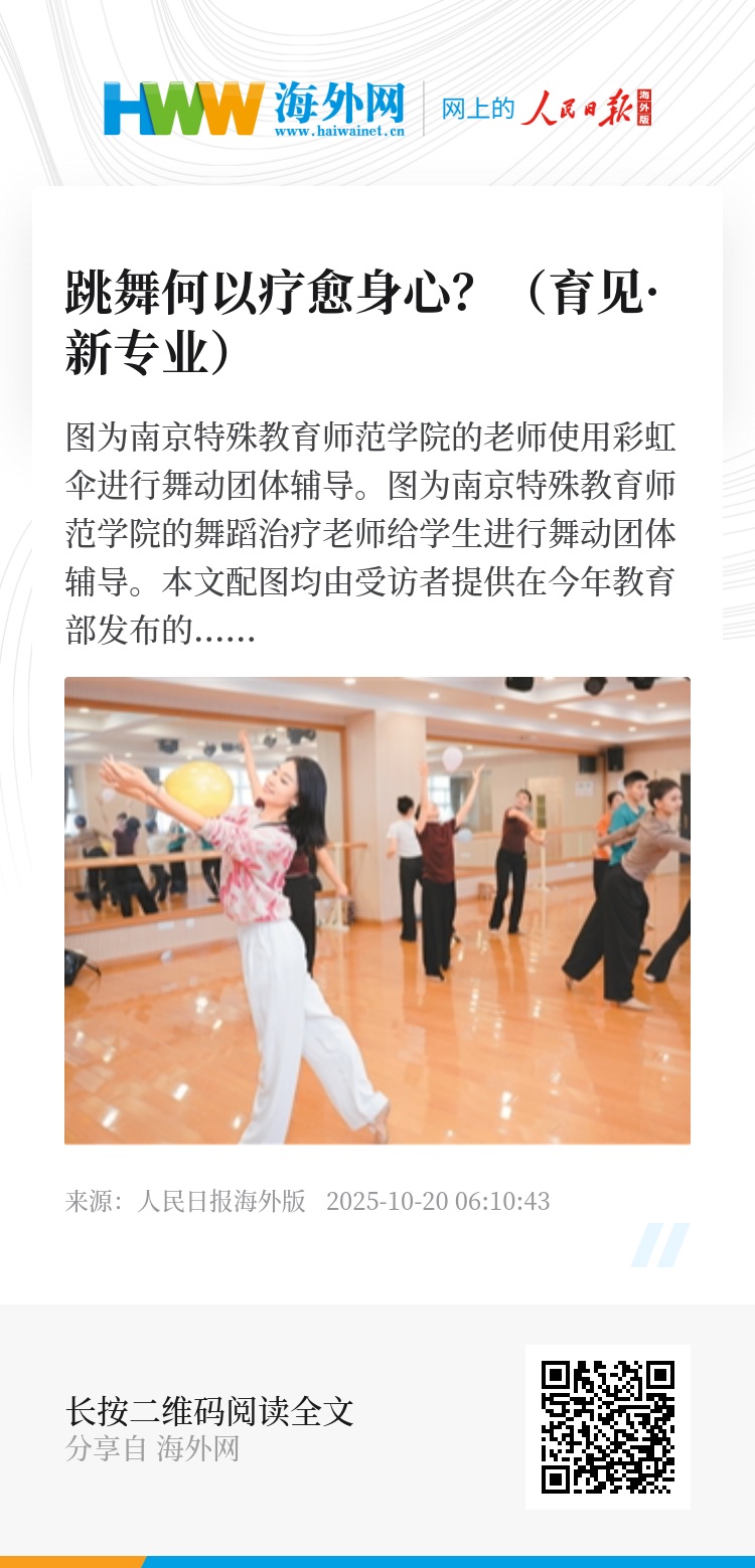在今年教育部发布的《普通高等学校本科专业目录(2025年)》中,“舞蹈治疗”被正式列入新增的29个本科专业之一,首个布点设在南京特殊教育师范学院,并已于今年启动招生。