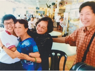 南侨机工后代汤耶碧(左二)与马来西亚亲人汤翠萍(左一)认亲时,林秋雅(右二)一起拥抱。
