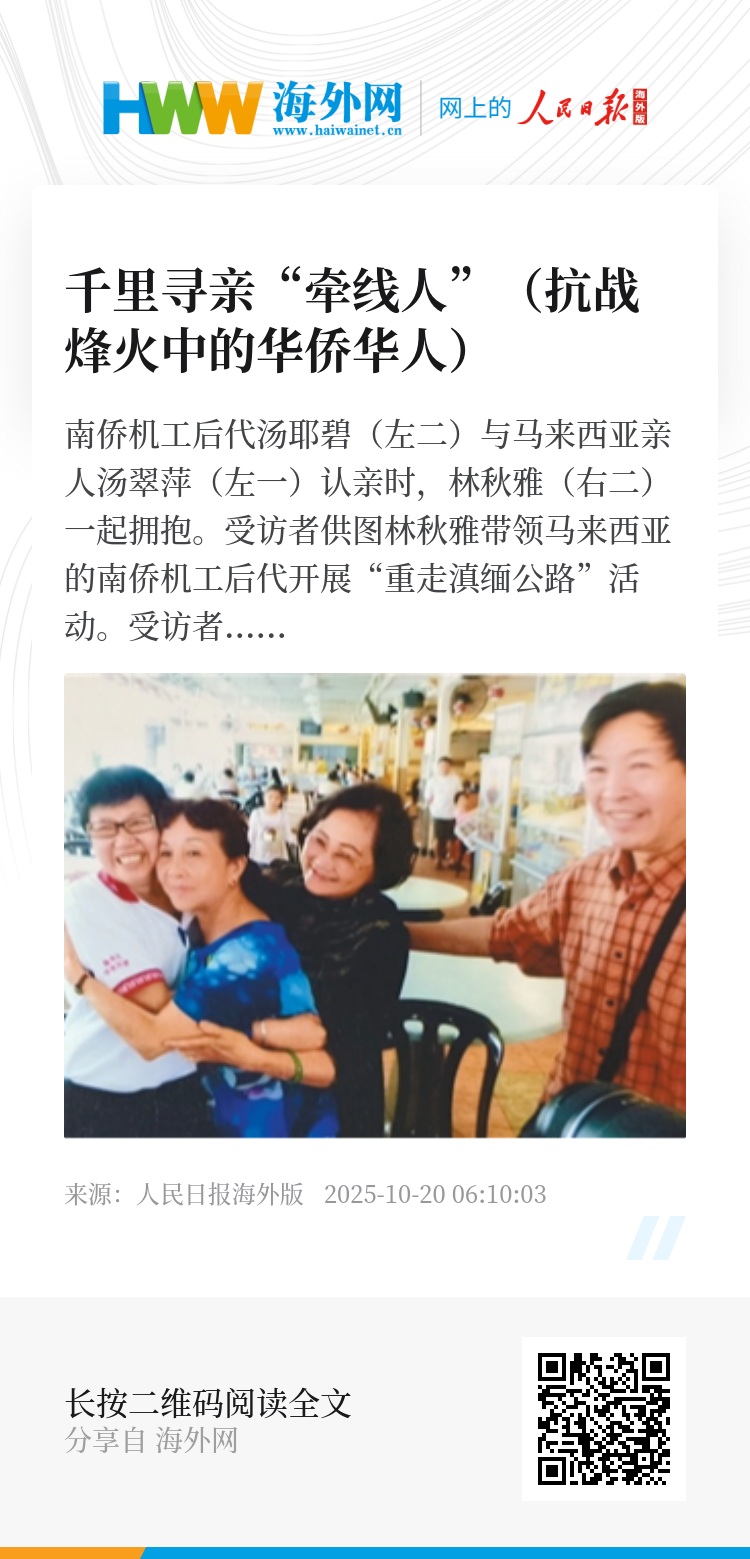 多年来,林秋雅多次组织中国、马来西亚等地的南侨机工后代友好交流,被机工后代称赞为“牵线人”。林秋雅说,寻亲、认亲,是为了历史与现实的血脉不被割舍。南侨机工到中国支援抗战,是马中两国共同抗战的历史记忆。让南侨机工的后代、亲人得以团聚,方能对得起他们当年的付出和牺牲。“作为海外华人,我要承担起承前启后的使命,传承祖辈爱国爱家的精神血脉,为促进马中两国民心相通多作贡献。”