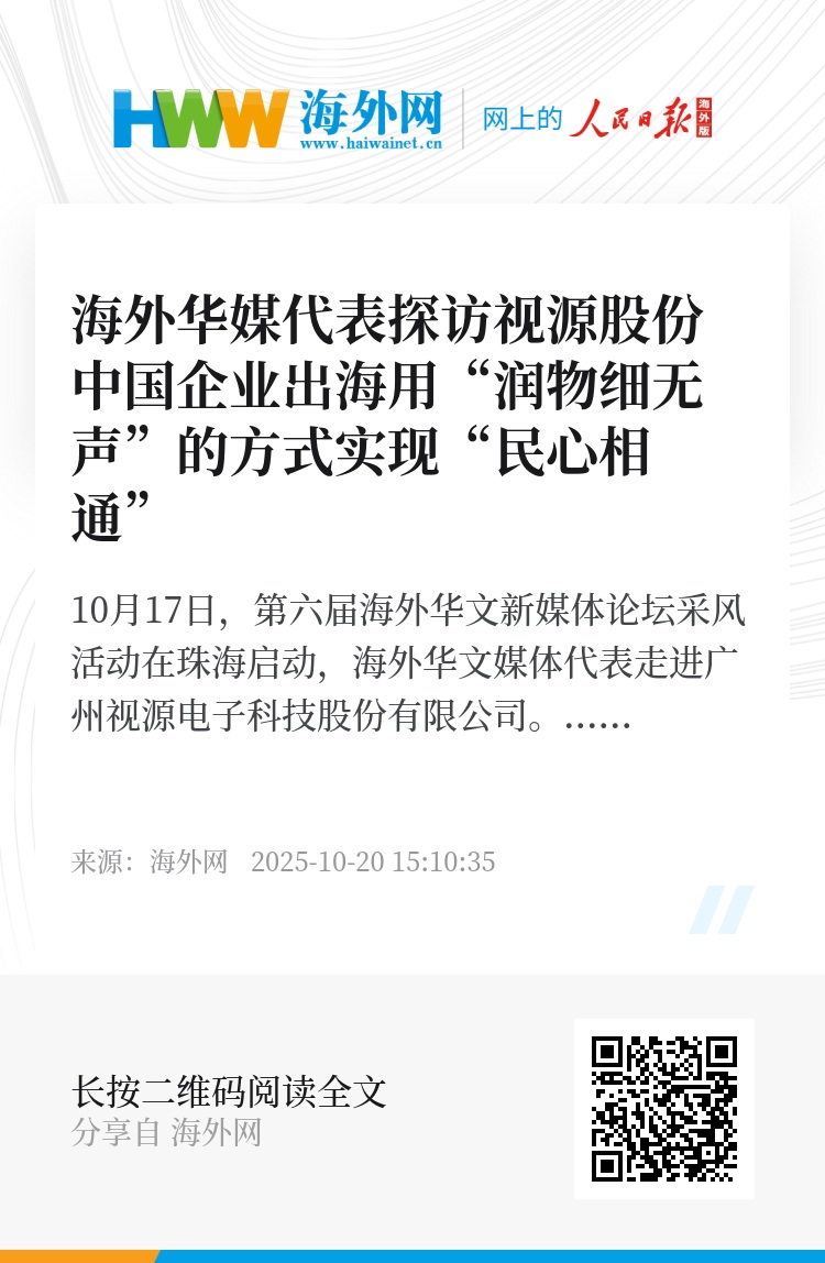 10月17日,第六届海外华文新媒体论坛采风活动在珠海启动,海外华文媒体代表走进广州视源电子科技股份有限公司。