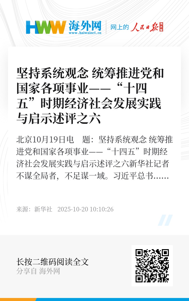 新华社北京10月19日电 题:坚持系统观念 统筹推进党和国家各项事业——“十四五”时期经济社会发展实践与启示述评之六