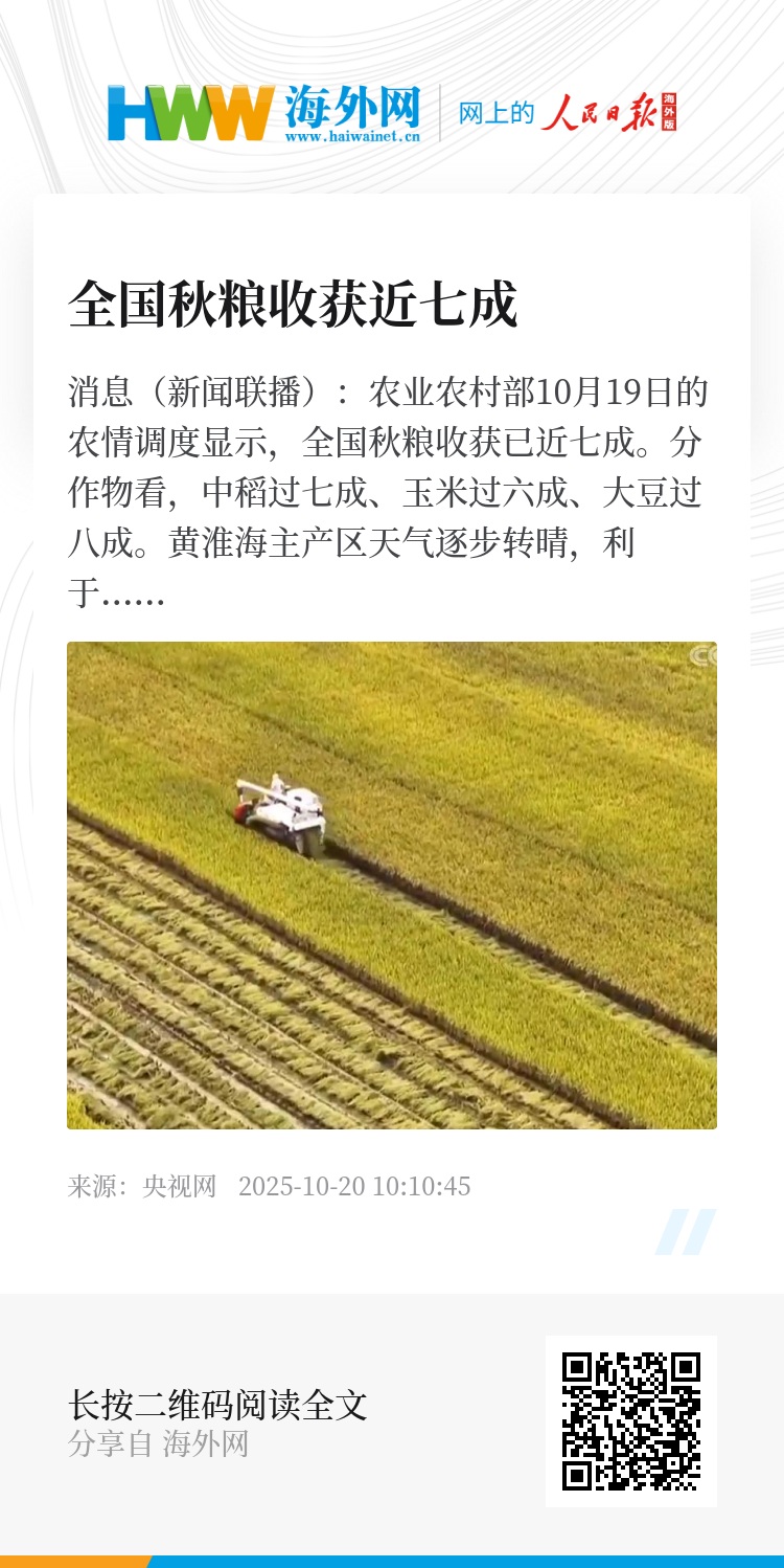 央视网消息(新闻联播):农业农村部10月19日的农情调度显示,全国秋粮收获已近七成。分作物看,中稻过七成、玉米过六成、大豆过八成。