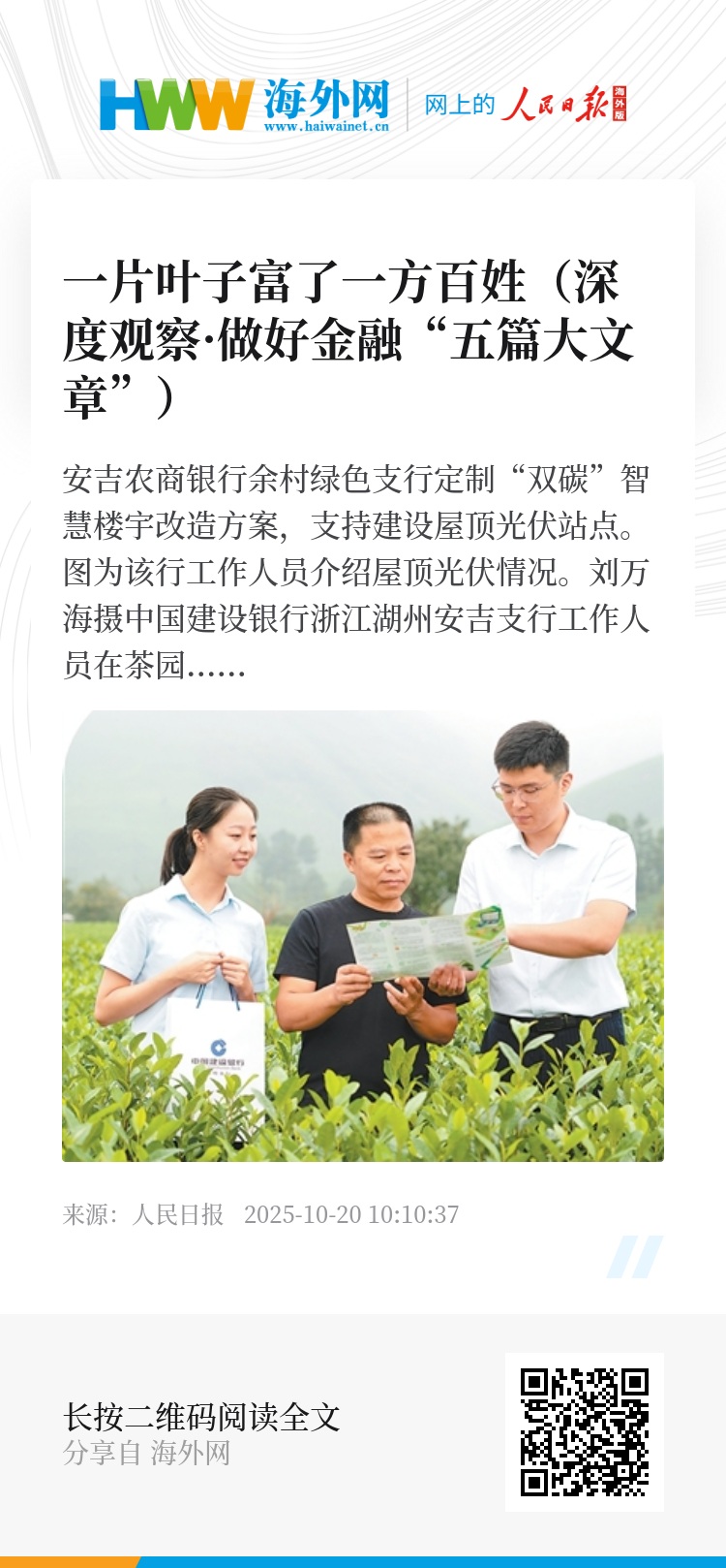 作为“绿水青山就是金山银山”理念诞生地,浙江省湖州市安吉县位于首批国家级绿色金融改革创新试验区内。在绿色发展理念引领下,这里的金融机构加快产品和服务创新步伐,加大对生态保护、绿色产业的支持力度,让金融“活水”持续滋养绿水青山。