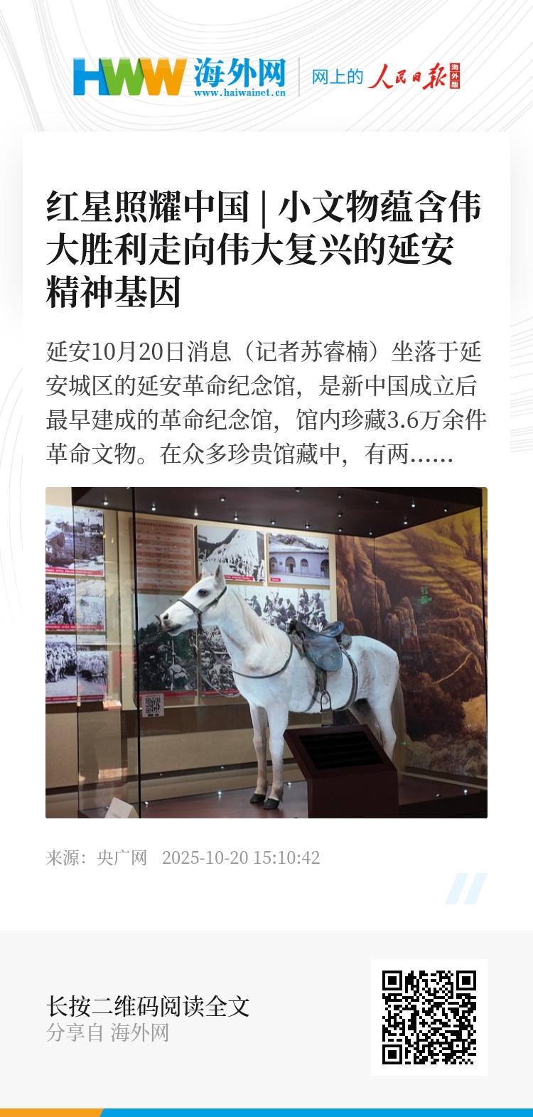 央广网延安10月20日消息(记者苏睿楠)坐落于延安城区的延安革命纪念馆,是新中国成立后最早建成的革命纪念馆,馆内珍藏3.6万余件革命文物。在众多珍贵馆藏中,有两件国家一级文物格外特殊:小青马标本与木质小炕桌。它们虽无华丽外表,却成为展现老一辈革命家务实作风的生动载体,让革命精神以更鲜活的方式走进大众视野。