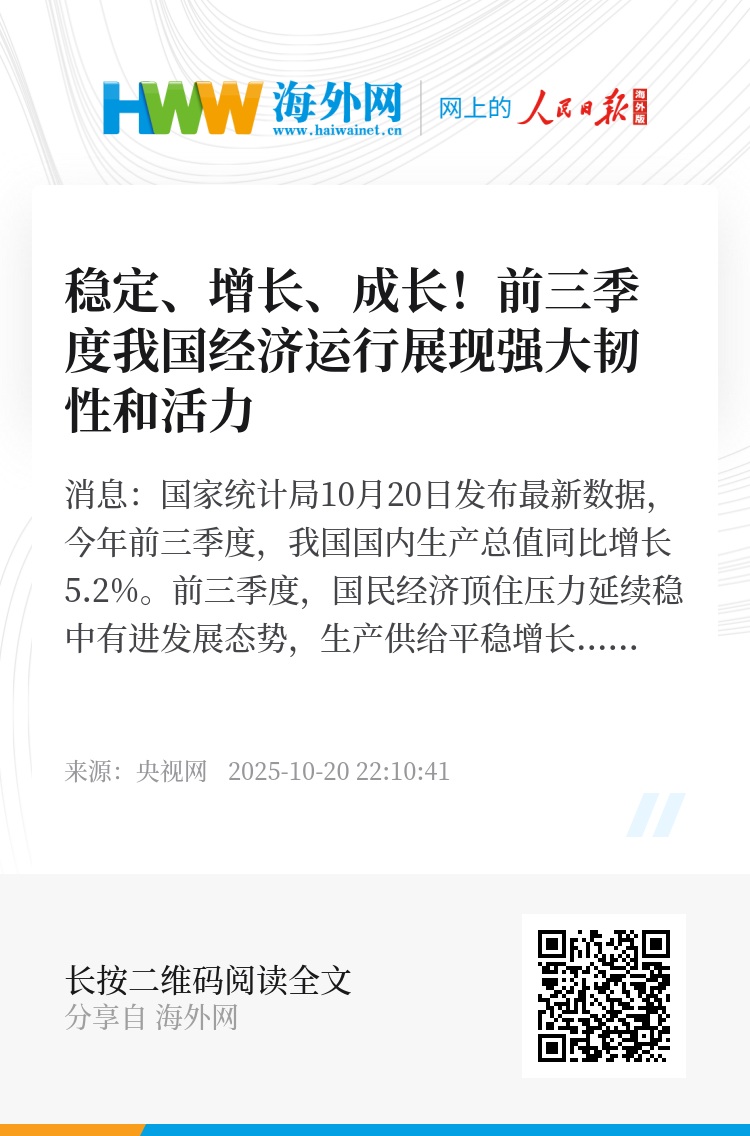 央视网消息:国家统计局10月20日发布最新数据,今年前三季度,我国国内生产总值同比增长5.2%。前三季度,国民经济顶住压力延续稳中有进发展态势,生产供给平稳增长,就业物价总体稳定,新动能稳步成长,经济运行展现出强大韧性和活力。
