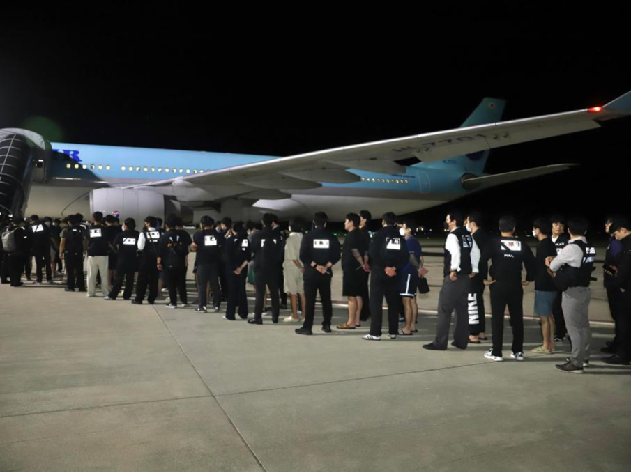 10月18日凌晨,在柬埔寨金边德崇国际机场,警察押送被遣返的韩国网络诈骗嫌疑人登机。新华社/柬新社